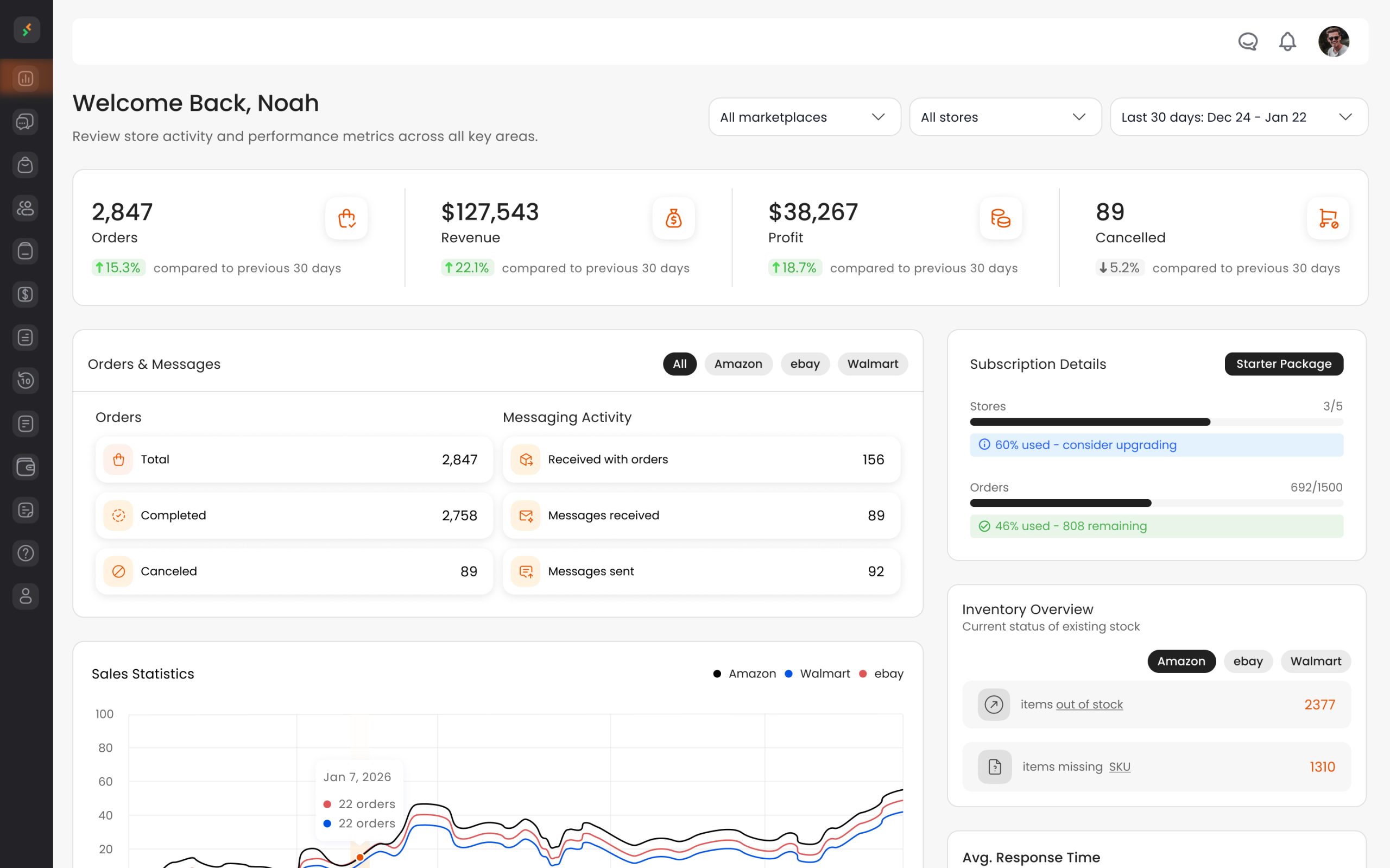 Our platform streamlines eCommerce operations by offering efficient inventory management, seamless order processing, and valuable business insights. With customizable dashboards and advanced analytics, businesses can optimize workflows and track performance across channels. Designed for scalability and ease of use, our solution helps businesses grow while saving valuable time.